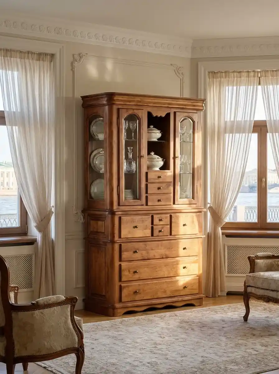 У буфета два отделения с остекленными дверцами, открытая ниша с полками и десять выдвижных ящиков разного размера. На ящиках и дверцах металлические ручки, на дверцы можно установить замки с ключами. Габариты комода (ШхГлхВ) 1250х515х2110 мм, вес 214 кг. Поставляется в разобранном виде. Гарантийный срок – 1 год.