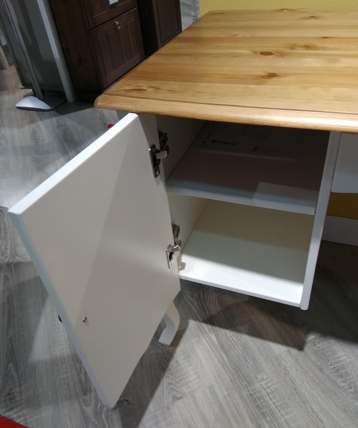 Стол имеет один центральный ящик и две тумбы, одну с дверцей и вторую с тремя выдвижными ящиками . Размеры ящиков: центральный 120х550 мм (фасад), высота стенок — 90 мм, боковые — 136х318 мм (фасады), высота стенок — 110 мм, дверь — 318х483 мм. Расстояние от пола до среднего ящика — 635 мм. Высота ножек — 240 мм. Днища ящиков изготовлены из ДВП белого цвета.